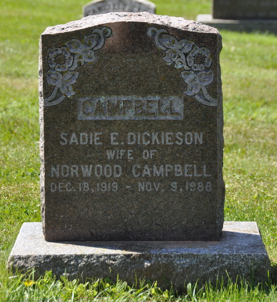 | Burial | She was buried in the Peoples Cemetery, Malpeque, Prince County, Prince Edward Island, Canada, 46.53041, -63.68669G. inscription: CAMPBELL / Sadie E. Dickieson / Wife of / Norwood Campbell / Dec. 18, 1919 - Nov. 9, 1988.1 Tombstone, Sadie E. Dickieson (1919-1988). Peoples Cemetery, Malpeque, Prince County, Prince Edward Island, Canada. |