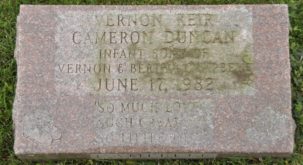 | Burial | He was buried in the Peoples Cemetery, New London, Queens County, Prince Edward Island, Canada, 46.46285, -63.51669G. Inscription: Vernon Keir / Cameron Duncan / Infant sons of / Vernon & Bertha Campbell / June 17, 1982 / "So much love / Such great joy / So little time." / CAMPBELL.1 Tombstone, Twins Vernon Keir Campbell (1982-1982) & Cameron Duncan Campbell (1982-1982). Peoples Cemetery, New London, Queens County, Prince Edward Island, Canada. |