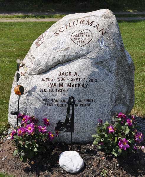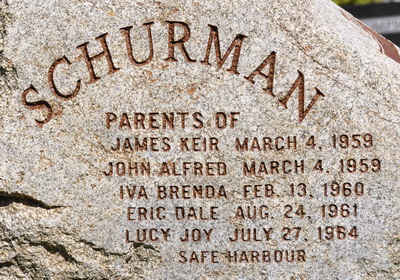 Inscription: SCHURMAN / Joined / Together / Sept. 22, 1956 // Jack A. Schurman / June 2, 1938 - Sept. 2, 2013 / Iva M. MacKay / Dec. 18, 1939 - / Lived together in Happiness / Rest together in peaceLeft: The Lord set my feet on a rock / And gave me a firm place to standRight: The Lord lives / Blessed be my rockBack: SCHURMAN / Parents of / James Keir March 4, 1959 / John Alfred March 4, 1959 / Iva Brenda Feb. 13, 1960 / Eric Dale Aug. 24, 1961 / Lucy Joy July 27, 1964 / Safe Harbour.2  Left inscription.  Right inscription.  Back inscription.  Tombstone, Jack A. Schurman (1938-2013), his wife Iva M. MacKay (1939- ). Peoples Cemetery, Kensington, Prince County, Prince Edward Island, Canada.