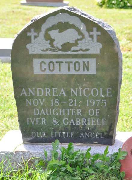 Inscription: COTTON / Andrea Nicole / Nov. 18 - 21, 1975 / Daughter of / Iver & Gabriele / Our Little Angel.1,2  Tombstone, Andrea Nicole Cotton (1975-1975). Peoples Cemetery, Kensington, Prince County, Prince Edward Island, Canada.