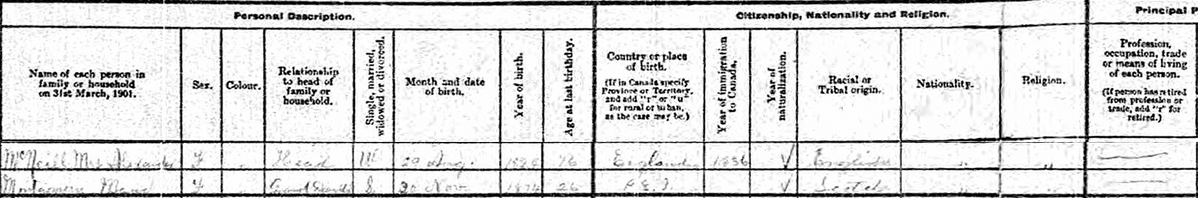 | Census | Lucy Ann Woolner was head of the household in the census on 1 May 1901 in Lot 23, New Glasgow, Queens County, Prince Edward Island, CanadaG. included in the household with widowed Lucy (age 76) was her granddaughter, Lucy Maud Montgomery (age 26). They were both Presbyterian.3 1901 Canada Census, New Glasgow, Queens County, Prince Edward Island. Household of widowed Lucy Ann (Woolner) MacNeill, and her granddaughter, Lucy Maud Montgomery. |