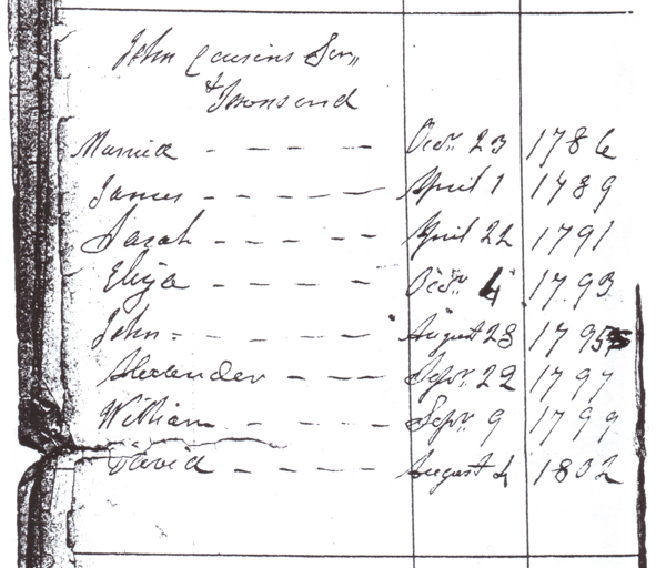 | Marriage | She married John Cousins on 23 October 1786, in Prince Edward IslandG.8,1 Church List of Families, Princetown Presbyterian Church, Malpeque, Prince Edward Island. Family of John Cousins Sr., his wife Mary Townsend, their children James, Sarah, Eliza, John, Alexander, William and David. |