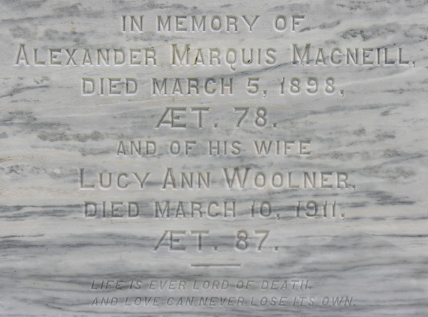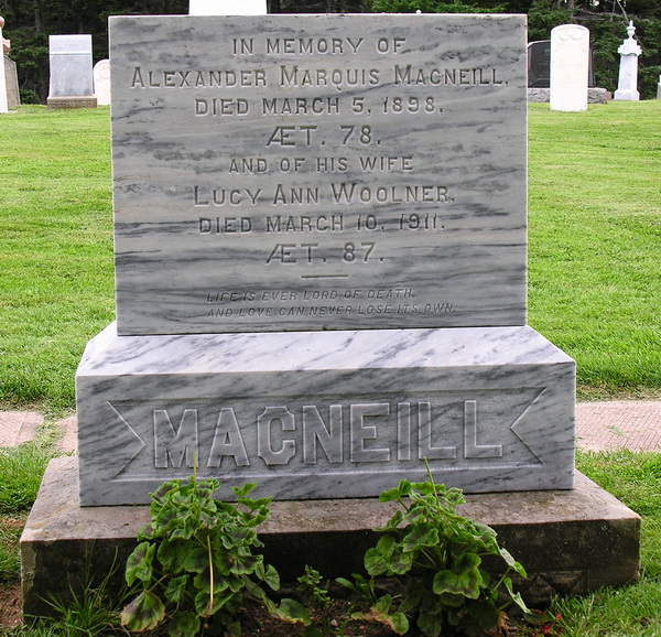 | Burial | He was buried in Cavendish Cemetery, Cavendish, Queens County, Prince Edward Island, Canada, 46.490867, -63.378683G. Inscription: In memory of / Alexander Marquis MacNeill, / Died March 5, 1898, / AET. 78. / And of His Wife / Lucy Ann Woolner / Died March 10, 1911, / AET. 87. / Life is ever Lord of death / And love can never lose its own. / MACNEILL.1 Tombstone, Alexander Marquis MacNeill (1820-1898) and his wife Lucy Ann Woolner (1824-1911), Cavendish Cemetery, Queens County, Prince Edward Island, Canada.  Inscription detail. |