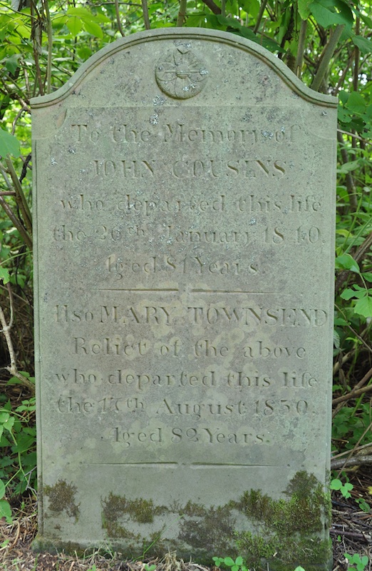 Inscription: To the Memory of / JOHN COUSINS / who departed this life / the 26th January 1840, / Aged 81 Years. / ---- / Also MARY TOWNSEND / Relict of the above / who departed this life / the 17th August 1850 / Aged 82 Years.1  Tombstone, John Cousins (1759-1840) & Mary Townsend (1768-1850), Yankee Hill Cemetery, French River, Queens County, Prince Edward Island, Canada.
