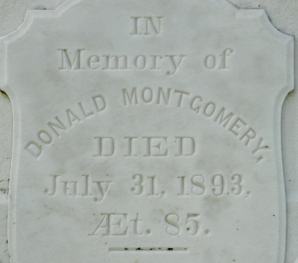 Inscription: In / Memory of / Donald Montgomery / Died / July 31, 1893, / Æt. 85.4,5  Tombstone, Donald Montgomery (1808-1893). Geddie Memorial Cemetery, Springbrook, Queens County, Prince Edward Island, Canada.  Front inscription detail.