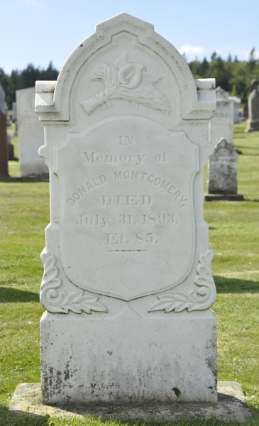 - [S9864] Cemetery marker, Geddie Memorial Cemetery, Springbrook, Queens County, Prince Edward Island, Canada. Donald Montgomery, tombstone inscription; read by David A. Walker, 10 September 2014.
