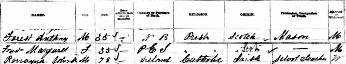 | Wife | She was enumerated on the census in 1881 in the household of Anthony Forrest, as his wife, in Chatham, Northumberland County, New Brunswick, CanadaG. Enumerated in the household with Anthony (age 35) were his wife Margaret Walker (age 35). Anthony was a mason. The family religion was Presbyterian. Also in the household was John Rorrayna, Sr. (age 78), a widowed school teacher, Irish, Catholic, likely an unrelated boarder.4![]() 1881 Canada Census, Chatham, Northumberland County, New Brunswick. Household of Anthony Forrest, his wife Margaret Walker, and an unrelated boarder. |
