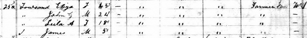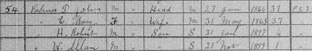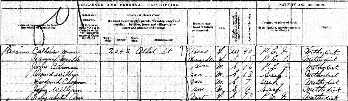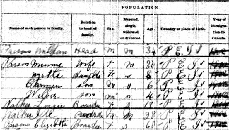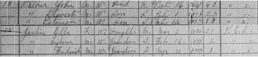 | adopted son | James Preston Evans Walker was enumerated on the census on 31 March 1901 in the household of William Walker as an adopted son in Lot 25, Prince County, Prince Edward Island, CanadaG.2![]() 1901 Canada Census, Lot 25, Prince Edward Island, household of William Walker. Listed in William's household were his wife Mary (Found) and adopted son James. The family religion was Presbyterian. William was a farmer, James a farmer's son. |
