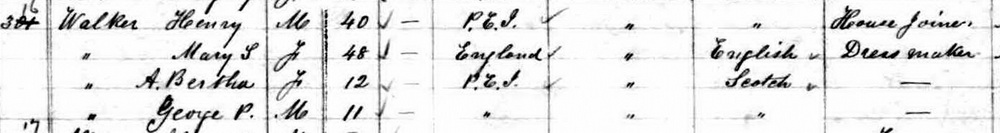 | Census | George Henry Walker was head of the household in the census on 4 April 1881 in Summerside, Prince County, Prince Edward Island, CanadaG. Enumerated in the household were Henry's wife Mary (Squires), daughter Bertha and son George. Henry's occupation was house joiner, and Mary was a dress maker. The family religion was Presbyterian.10![]() 1881 Canada Census, George Henry Walker household, wife Mary (Squires), daughter Bertha and son George. Summerside, Prince County, Prince Edward Island, Canada. |