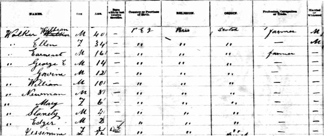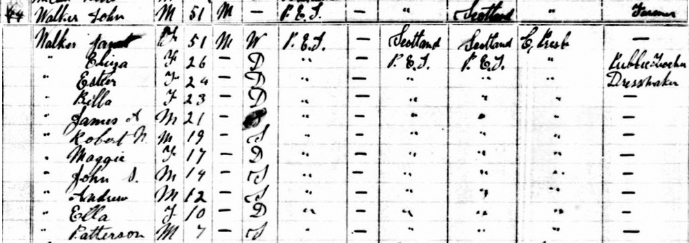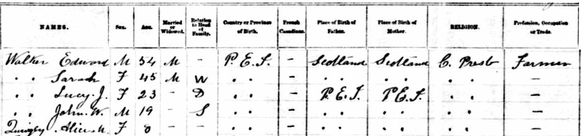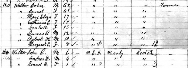 | grandson | He was enumerated on the census in 1881 in the household of John Walker, as a grandson, in Lot 19, New Annan, Prince County, Prince Edward Island, CanadaG.4![]() 1881 Canada Census return for the household of John Walker, Lot 19, New Annan, Prince Edward Island |