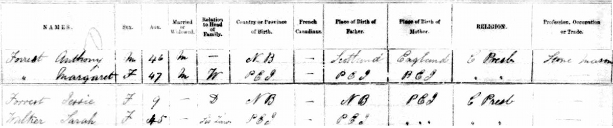 | Wife | She was enumerated on the census on 15 April 1891 in the household of Anthony Forrest, as his wife, in Chatham, Northumberland County, New Brunswick, CanadaG. Enumerated in the household with Anthony (age 46) were his wife Margaret Walker (age 47), their daughter Jessie (age 9), and Margaret's sister Sarah Walker (age 45). Anthony was a stone mason. The family religion was Presbyterian.4![]() 1891 Canada Census, Chatham, Northumberland County, New Brunswick. Household of Anthony Forrest, his wife Margaret Walker, their daughter Jessie, and Margaret's sister Sarah Walker. |