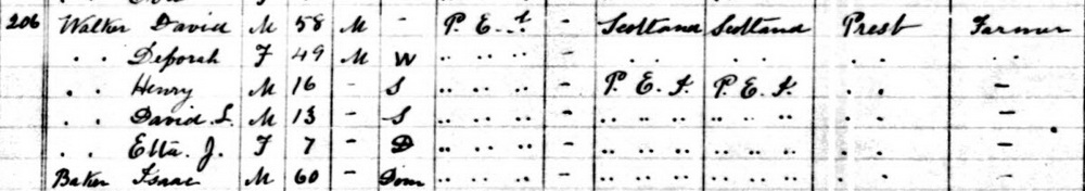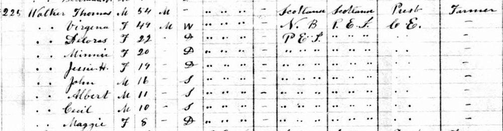 | Census | He was head of the household in the census on 27 April 1891 in Lot 19, New Annan, Prince County, Prince Edward Island, CanadaG. Records for 1891 Census showed David's parents were born in Scotland. 1891 Census, Residence was Lot 19, Number of Family was 206. He was listed with his wife Deborah (Lowther), sons Henry & David L., and daughter Etta J. Isaac Baxter, aged 60, lived in the household as a domestic. The family religion was Free Church of Scotland/Presbyterian. David was a farmer. The house was described as wooden, 1.5 stories and 9 rooms.9![]() 1891 Canada Census, Lot 19, Prince Edward Island, household of David Walker, son of John Walker & Jane Weir. Records for 1891 Census showed David's parents were born in Scotland. He was listed with his wife Deborah (Lowther), sons Henry & David L., and daughter Etta J. Isaac Baxter, aged 60, lived in the household as a domestic. The family religion was Free Church of Scotland/Presbyterian. John was a farmer. |
