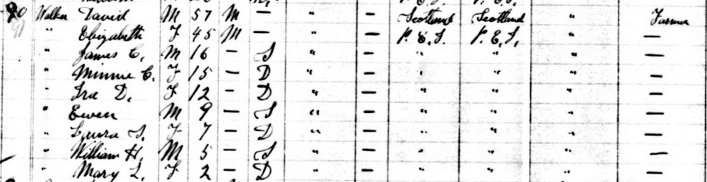 | Census | He was head of the household in the census on 31 March 1901 in Lot 19, New Annan, Prince County, Prince Edward Island, CanadaG. Enumerated in the household with David were his wife Deborah, sons Harry and David, and daughter Etta. The family religion was Presbyterian. David was a farmer. Harry and David Jr. were listed as farmer's sons.10![]() 1901 Canada Census, Lot 19, Prince Edward Island, household of David Walker. Listed in the household were David's Wife Deborah, sons Harry and David, and daughter Etta. The family religion was Presbyterian. David was a farmer. |