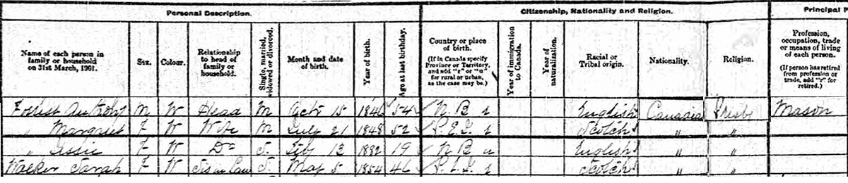 | Wife | She was enumerated on the census on 31 March 1901 in the household of Anthony Forrest, as his wife and Anthony Forrest, in Chatham, Northumberland County, New Brunswick, CanadaG. Enumerated in the household with Anthony (age 54) were his wife Margaret Walker (age 52), daughter Jessie (age 19) and Margaret's sister, Sarah Walker (age 46). Although Sarah's baptismal date was recorded as 11 August 1848, her birth date recorded in the 1901 census was 5 May 1854, which is more likely to be 5 May 1848.5![]() 1901 Canada Census, Chatham, Northumberland County, New Brunswick. Household of Anthony Forrest, his wife Margaret Walker, their daughter Jessie, and Margaret's sister Sarah Walker. |