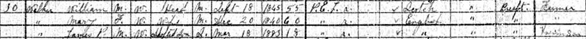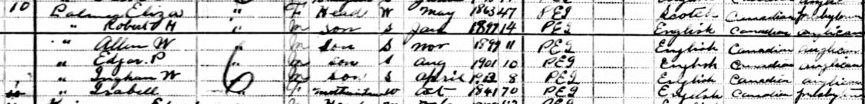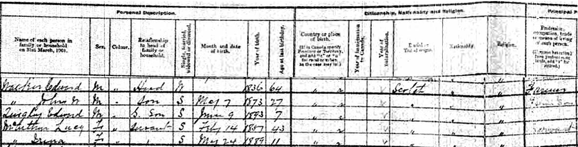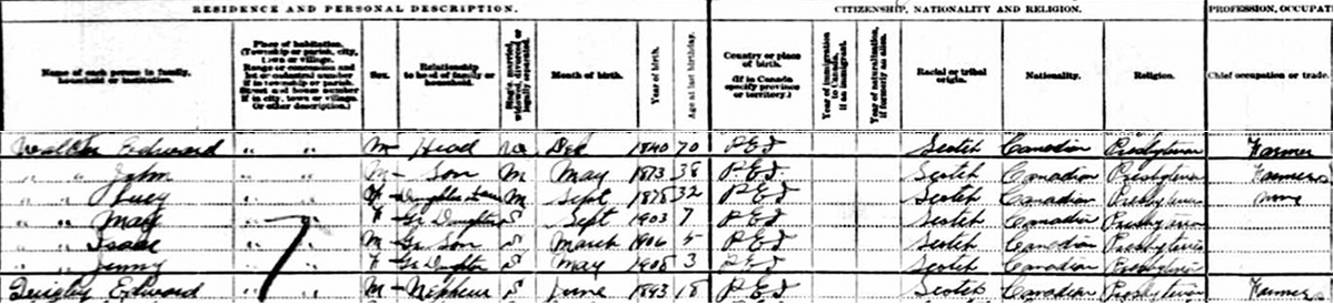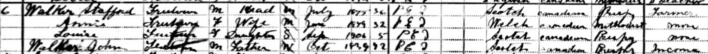 | Census | He was head of the household in the census on 31 March 1901 in Lot 25, Prince County, Prince Edward Island, CanadaG. Enumerated in William's household were his wife Mary (Found) and adopted son James. The family religion was Presbyterian. William was a farmer, James a farmer's son.9![]() 1901 Canada Census, Lot 25, Prince Edward Island, household of William Walker. Listed in William's household were his wife Mary (Found) and adopted son James. The family religion was Presbyterian. William was a farmer, James a farmer's son. |