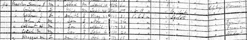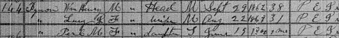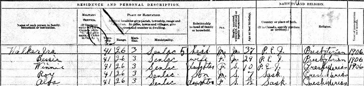 | Son | He was enumerated on the census in 1921 in the household of David Lowther Walker, as a son, in Travellers Rest, Prince County, Prince Edward Island, CanadaG. enumerated in the household with David (age 43) were his wife Margaret Ferguson (age 39), their children Leroy (age 7) & Helen (age 5), David's mother Deborah Lowther (age 79), his sister Etta (age 35) and James McDonald (age 26), an unrelated servant. David was a farmer, Leroy a student. The family religion was Presbyterian.2![]() 1921 Canada Census, Travellers Rest, Prince County, Prince Edward Island. Household of David Walker, his wife Margaret Ferguson, their children Leroy & Helen, David's mother Debora Lowther, David's sister Etta and an unrelated James McDonald. Census image courtesy of Library & Archives Canada. |
