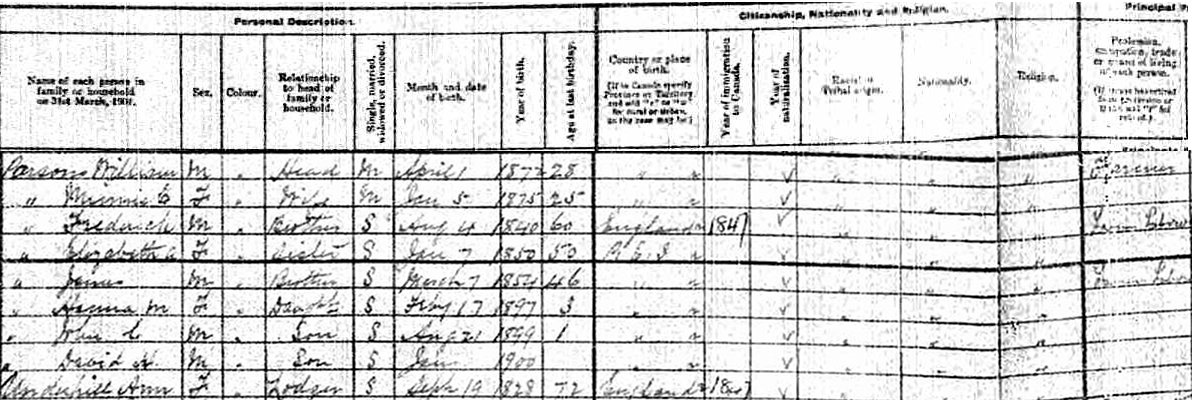 | Census | He was head of the household in the census on 4 April 1881 in Lot 25, Prince County, Prince Edward Island, CanadaG. Enumerated in the household of William (age 36) was his wife Mary Found (age 32). William was a farmer. Both were Presbyterian.7 |