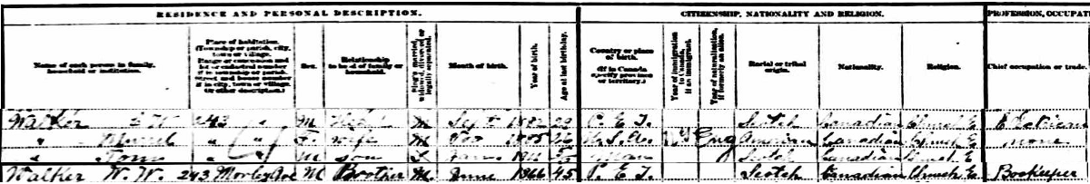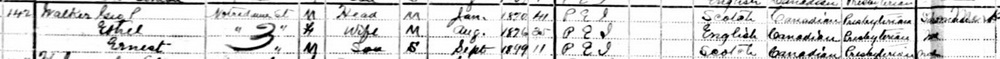 | Census | He was head of the household in the census on 14 June 1911 in Notre Dame St., Summerside, Prince County, Prince Edward Island, CanadaG. Enumerated in the household were George's wife Ethel and son Ernest. Their daughter Evelyn died at 7 months in 1910. The family religion was Presbyterian. The entry for his occupation is salesman (?).11![]() 1911 Canada Census, Summerside, Prince Edward Island, household of George P. Walker. Included in the household were George's wife Ethel (Underhay) and son Ernest. Their daughter Evelyn died at 7 months in 1910. The family religion was Presbyterian. The entry for his occupation is salesman (?). |
