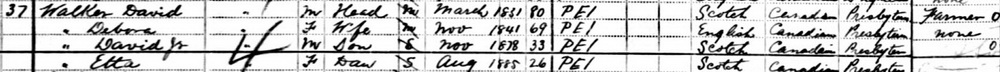 | Son | David Walker was enumerated on the census in 1881 in the household of John Walker, as a son, in Lot 19, New Annan, Prince County, Prince Edward Island, CanadaG. Enumerated in this household with John were his wife, Jane, and their son David and wife Deborah (Lowther), and grandchildren John, Henry and David. John's occupation was listed as farmer. Transcriptions listed on the LDS and Ancestry.ca web sites incorrectly show John as a member of the household of his brother, Robert. The original census page images clearly show him to be the head of his own household.8![]() 1881 Canada Census return for the household of John Walker, Lot 19, New Annan, Prince Edward Island |