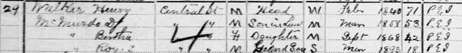 | Census | He was head of the household in the census on 3 June 1911 in Central St., Summerside, Prince County, Prince Edward Island, CanadaG. Henry (age 71) was a widower at this time. In the same household were his daughter Bertha (age 42), son-in-law, David J. McMurdo (age 53), and grandson Roy (age 18).5![]() 1911 Canada Census, George Henry Walker household, daughter Bertha, her husband David McMurdo and grandson Roy. Summerside, Prince County, Prince Edward Island, Canada. |