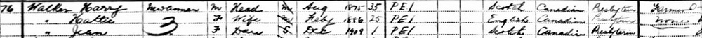 | Census | Henry Osborne Weir Walker was head of the household in the census on 1 June 1911 in New Annan, Prince County, Prince Edward Island, CanadaG. Enumerated in the household with Harry were his wife Hattie (Clarke) and daughter Jean. The family religion was Presbyterian. Harry was a farmer.11![]() 1911 Canada Census, New Annan, Prince Edward Island, Harry Walker. Also listed in the household were Harry's wife Hattie (Clarke) and daughter Jean. The family religion was Presbyterian. Harry was a farmer. |