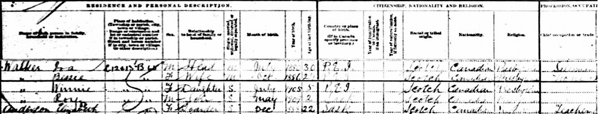 | Son | He was enumerated on the census on 17 April 1891 in the household of William Walker, as a son, in Lot 25, Prince County, Prince Edward Island, CanadaG. William was enumerated in household #87 with his wife Mary (Found) and son James. A widow Sarah Connells, 60 years old, born in Nova Scotia and a Methodist, was living in the household, with no indicated relationship to the family. William's family was Presbyterian. He was listed as a farmer.5![]() 1891 Canada Census, Lot 25, Prince County, Prince Edward Island, household of William & Mary (Found) Walker and their son James. A widow Sarah Connells, 60 years old, born in Nova Scotia and a Methodist, was living in the household, with no indicated relationship to the family. William's family was Presbyterian. He was listed as a farmer. |