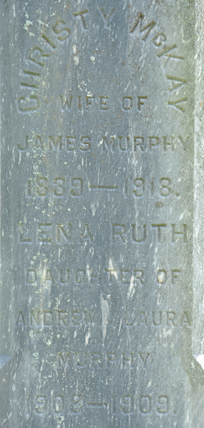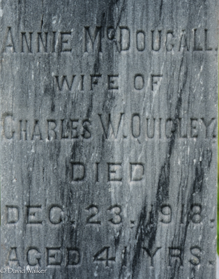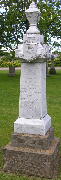 | Burial | He was buried in the Peoples Cemetery, Summerside, Prince County, Prince Edward Island, Canada, 46.405400, -63.776967G. Inscription: In / memory of / Mary S. Smythe / wife of / G. Henry Walker / Born / Nov. 24, 1833. / Died / Mar. 15, 1904.Left: In / Memory of / David J. McMurdo / Born Mar. 1, 1858 / Died / June 21, 1943.Right: In / Memory of / G. Henry Walker / Born / Feb 28. 1840 / Died / Dec. 20, 1929.Back: In / Memory of / A. Bertha Walker / wife of / David J. McMurdo / Born Sept. 24, 1868. / Died / July 29, 1956.6 ![]() Tombstone, Annie Bertha Walker (1868-1956), George Henry Walker (1840-1929), David J. McMurdo (1858-1943), Mary Squires Smythe (1833-1904). Peoples Cemetery, Summerside, Prince County, Prince Edward Island, Canada. ![]() Left inscription. |
