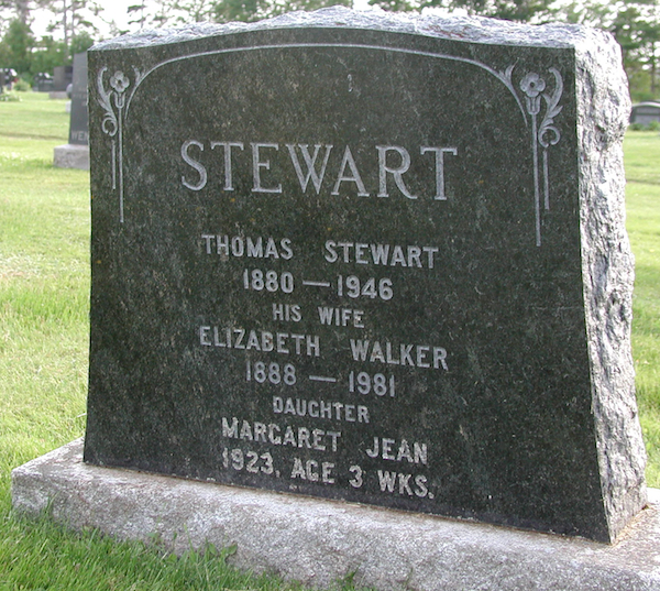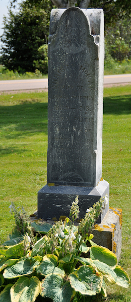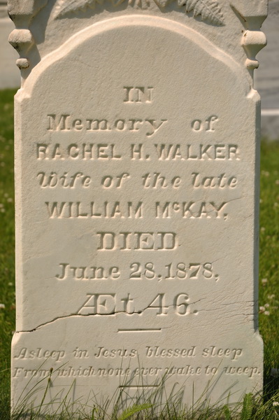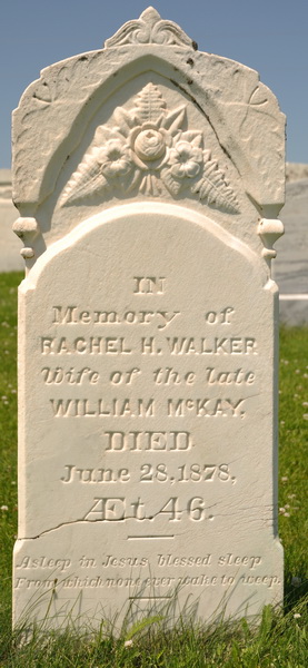 | Burial | She was buried in the Presbyterian Cemetery, North Bedeque, Prince County, Prince Edward Island, Canada, 46.36167, -63.72578G. Inscription: In / Memory of / Rachel H. Walker / wife of the late / William McKay, / Died / June 28, 1878, / AEt. 46 / Asleep in Jesus blessed sleep / from which none ever wake to weep ------ Godkin (stone carver.)3 ![]() Tombstone, Rachel Hamilton Walker (1829-1878)North Bedeque Cemetery, Prince County, Prince Edward Island, Canada. ![]() Inscription detail. |