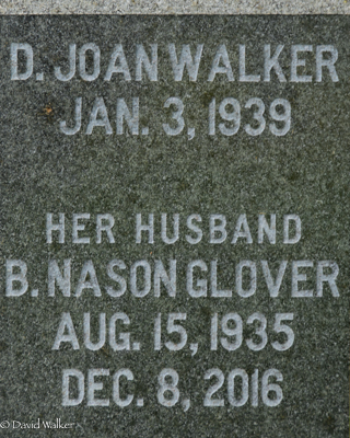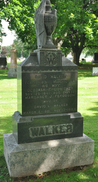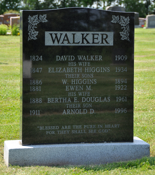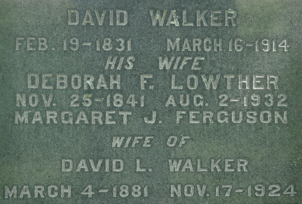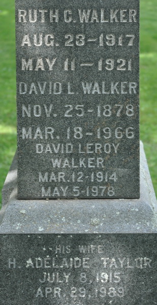 | Burial | He was buried in the Peoples Cemetery, Summerside, Prince County, Prince Edward Island, Canada, 46.40442, -63.77681G. Inscription: David Walker / Feb. 19 - 1831 March 16 - 1914 / His Wife / Deborah F. Lowther / Nov. 25 - 1841 Aug. 2 - 1932 / Margaret J. Ferguson / Wife of / David L. Walker / March 4 - 1881 Nov. 17 - 1924 / WALKER. Left: D. Joan Walker / Jan. 3, 1939 / 22 January 2020 / Her Husband / B. Nason Glover / Aug. 15, 1935 / Dec. 8, 2016 Right: Ruth C. Walker / Aug. 23 - 1917 / May 11 - 1921 / David L. Walker / Nov. 25 - 1878 / Mar. 18 - 1966 / David Leroy / Walker / Mar. 12 - 1914 / May 5 - 1978 / His Wife / H. Adelaide Taylor / July 8, 1915 / Apr. 29, 1989. Back: Harry W. Walker / Aug. 3 - 1872 July 27 - 1940 / His Wife / Harriet L. Clark / Feb. 11 - 1885 June 27 - 1953 / WALKER.15,16 ![]() Right inscription detail. ![]() Tombstone, David Walker (1831-1914) and family members, Peoples Cemetery, Summerside, Prince County, Prince Edward Island, Canada. ![]() Front inscription detail. ![]() Back inscription detail. ![]() Right inscription detail. |