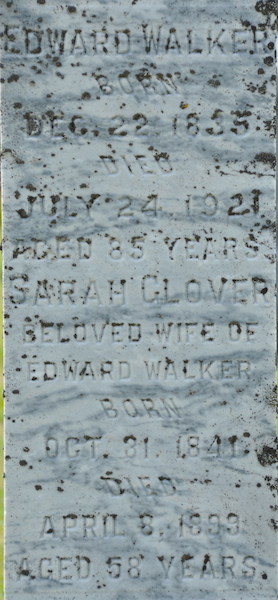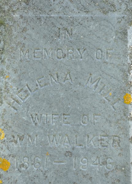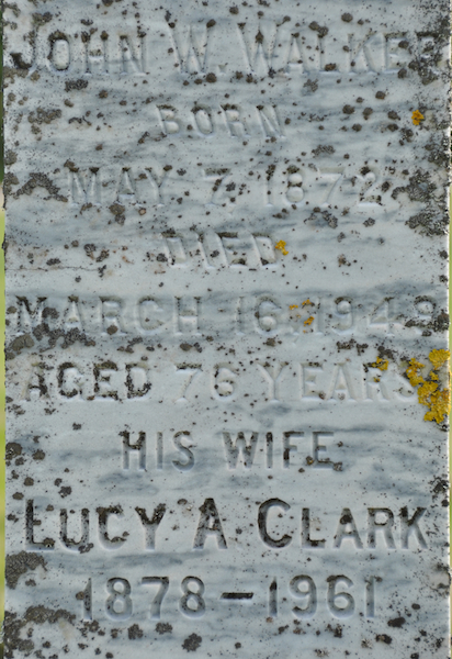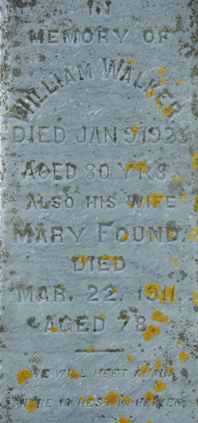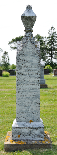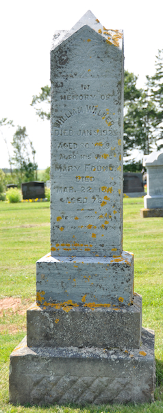 | Burial | He was buried in the Peoples Cemetery, Kensington, Prince County, Prince Edward Island, Canada, 46.44744, -63.62881G. Inscription: In / Memory of / William Walker / Died Jan. 9, 1925 / Aged 80 Yrs. / Also His Wife / Mary Found / Died / Mar. 22, 1911. / Aged 78 / We will meet again / There to rest in Heaven. Left: WALKER (on base) Right: In / Memory of / Helena Mill / Wife of / Wm. Walker / 1861 - 1946.15 ![]() Tombstone, William Walker (1845-1925), his wife Mary Found (1833-1911), his second wife Helena Mill (1861-1946). The Peoples Cemetery, Kensington, Prince County, Prince Edward Island, Canada. ![]() Front inscription detail. ![]() Right inscription detail. |