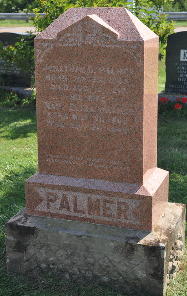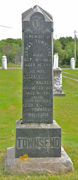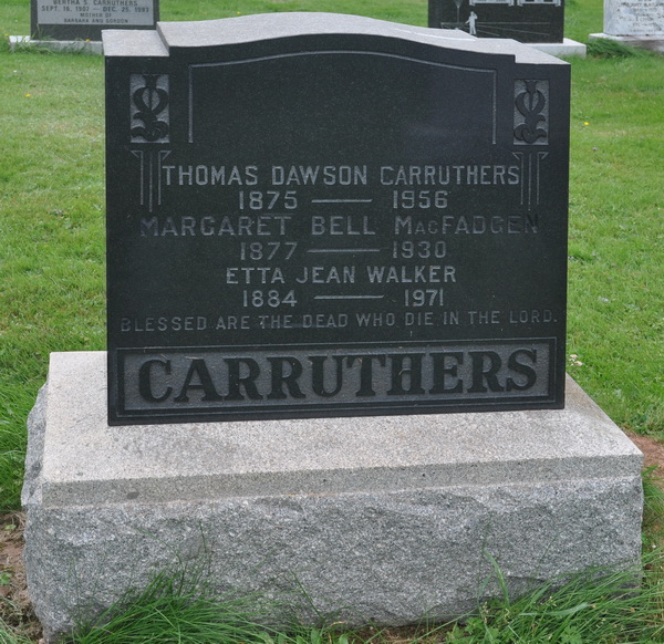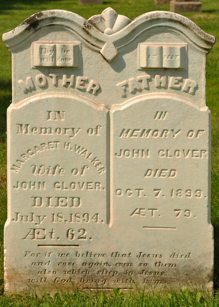 | Burial | She was buried in the Peoples Cemetery; United Presbyterian Church, Malpeque, Prince County, Prince Edward Island, Canada, 46.52974, -63.68728G. Decorative white marble stone. Inscription on left of centre: Thy will be done / Mother / In / Memory of / Margaret H. Walker / Wife of / John Glover, / Died / July 18, 1894, / AEt. 62. / - /Inscription on right of centre: At Rest / Father / In / Memory of /John Glover / Died / Oct. 7, 1899, / AET. 79. /Script: For if we believe that Jesus died / and rose again even so them / also which sleep in Jesus / will God bring with him. Cairns & McLean" (stonecutters).9 ![]() Tombstone, John Glover (1820-1899) and Margaret Hetherington Walker 1832-1894), the Peoples Cemetery, Princetown United Church, Malpeque, Prince County, Prince Edward Island, Canada. |
