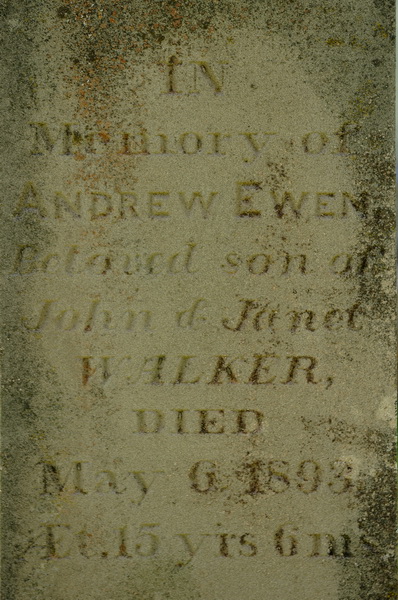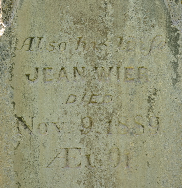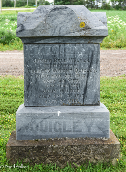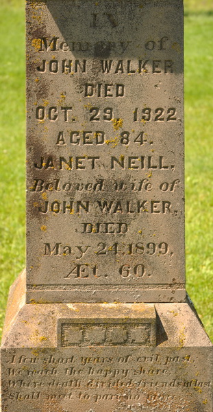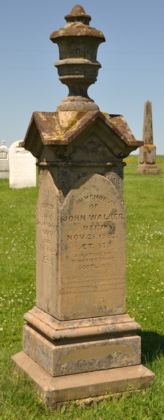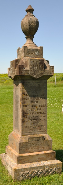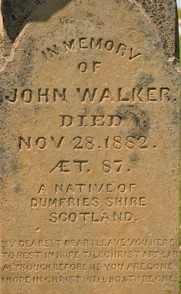 | Interred | He was buried in the plot of John Walker, in the Presbyterian Cemetery, North Bedeque, Prince County, Prince Edward Island, Canada, 46.36162, -63.72578G. Inscription: In Memory / of / John Walker / Died / Nov. 28, 1882. / AEt. 87. / A Native of / Dumfriesshire / Scotland / My Dearest Dear I Leave You Here / To Rest in Hope Till Christ Appear. Left: John Lea / Son of / David & Debora / Walker / Died / July 1, 1889. / AEt. 17. Right: Also his wife / Jean Wier / Died / Nov. 9, 1889. / AEt. 91.10 ![]() Tombstone of John Walker (1795-1882)North Bedeque Cemetery, Prince County, Prince Edward Island, Canada. His wife Jane Davidson Weir and grandson John Lea Walker are also buried here. ![]() Inscription detail on the obelisk tombstone of John Walker. ![]() Left side, inscription for John Lea Walker, grandson of John Walker and Jane Weir. ![]() Right side, inscription for Jane Davidson Weir (note the inscription reads Jean Wier). |
