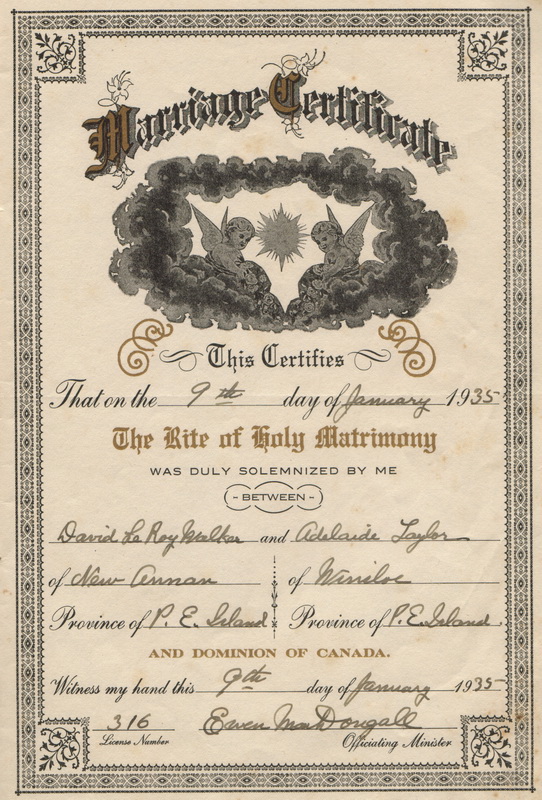 | Marriage | David Lowther Walker married Margaret Jean Ferguson daughter of Duncan Ferguson and Charlotte Geddie Montgomery, on 12 October 1912, David was a bachelor, living in New Annan, Margaret was a spinster, living in Summerside.9,10![]() Marriage certificate of David Lowther Walker and Margaret Jean Ferguson. |