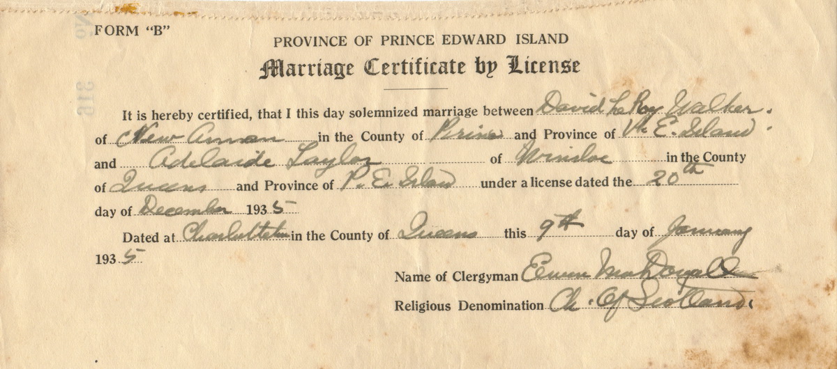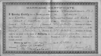 | Marriage | He married Mildred Whitehead daughter of David Whitehead and Jane Johnstone, on 24 December 1905, in Clinton, Queens County, Prince Edward Island, CanadaG. Preston Walker of Kelvin Grove, PEI (B), Mildred Whitehead of Clinton, PEI (S). They were married by Rev. John Murray, of New London, PEI. Witnesses were John Whitehead and Kate MacLeod.3,6 |