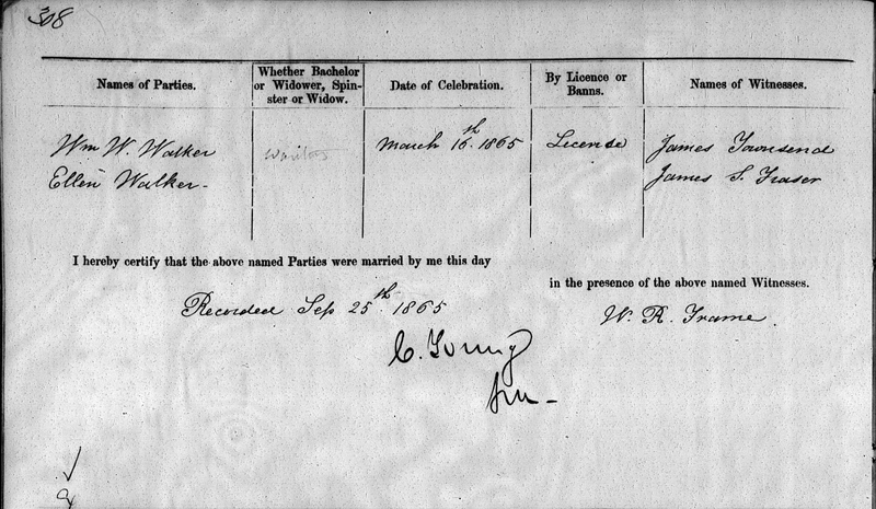 | Marriage | He married Mary Squires Smythe daughter of James Kinsman and Ann Squire, on 7 November 1867, in Prince Edward IslandG. George Henry Walker married Mary S. Smeeth, 7 November 1867, by license by W.R. Frame. Witnesses were George Beairsto and Mary Walker. Recorded 24 Feb. 1868, C. Young, Surrogate. Source: Marriages Book #11, 1867-1871, Pg. 17. Marriage Announcement "At the Manse, on Tuesday evening, 7th inst., by the Rev. W. A. Frame, assisted by the Rev. N. McKay of St. John, N.B., Mr. George Henry Walker, of Summerside, to Miss Mary M. Smeeth, of St. Eleanors". Published in The Islander Nov 15, 1867. Henry was a bachelor, living in Summerside. Mary was a spinster, living in St. Eleanors.7,8,9 |