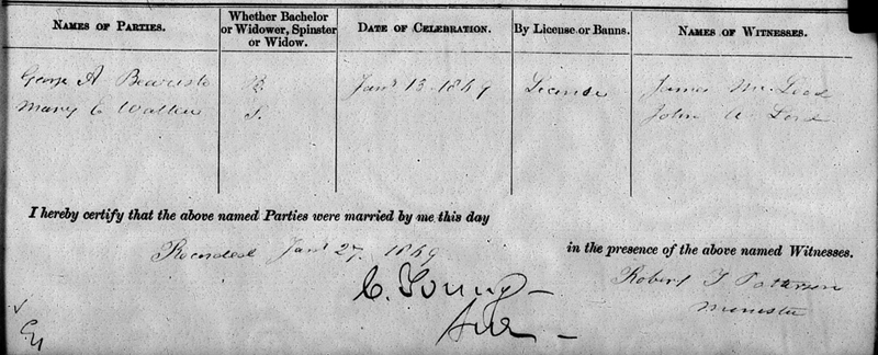 | Marriage | She married George Aitken Beairsto on 13 January 1869 in Summerside, Prince County, Prince Edward IslandG, by license, Robt. Patterson, Minister. Witnesses James M'Leod & John A. Lord. Recorded 27 Jan. 1869, C. Young, Surrogate. Marriages 1867-1871, Book #11, P. 100. "Married: At Summerside on the 13th ult. by the Rev. R.S. Patterson, Mr. George A. Bearisto, of Summerside, to Mary E., third daughter of Mr. David Walker, Kensington". [The Islander, 5 Feb. 1869, p.3; Summerside Journal, 21 January 1869.].5,6 ![]() Marriage Registration, George A. Beairsto and Mary Eliza Walker. |