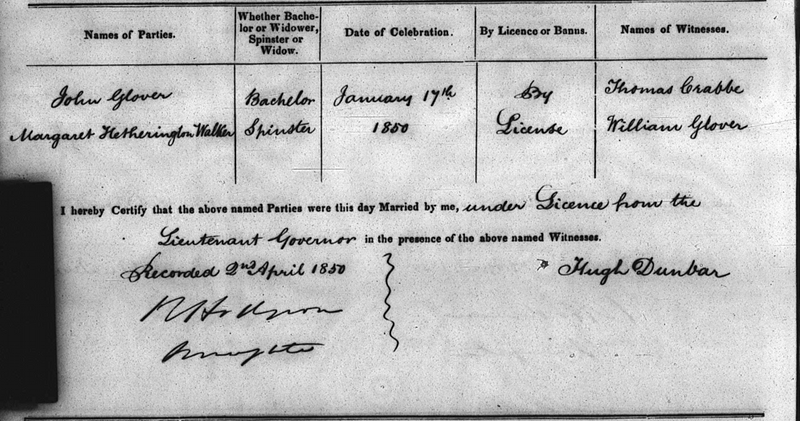 | Marriage | She married John Glover son of William Glover and Ann Watmough, on 17 January 1850, in Prince County, Prince Edward IslandG. Margaret Hetherington Walker, Spinster John Glover, Bachelor Married by License, January 17, 1850 , by Hugh Dunbar. Witnesses: Thomas Crabbe & William Glover. Recorded by R. Hodgson, Surrogate. Marriage Record: Margaret Hetherington Walker (spinster) John Glover (bachelor) Married by license on 17 January 1850 by Hugh Dunbar Witnesses: Thomas Crabbe & William Glover Recorded 2 April 1850 - R. Hodgson, surrogate. Newspaper announcement: "On the 17th, by the Rev. Hugh Dunbar, Mr. John Glover Lot 19, to Margaret Hetherington, eldest daughter of Mr. David Walker, of the same place."7,8 ![]() Marriage Registration, John Glover and Margaret Hetherington Walker. |