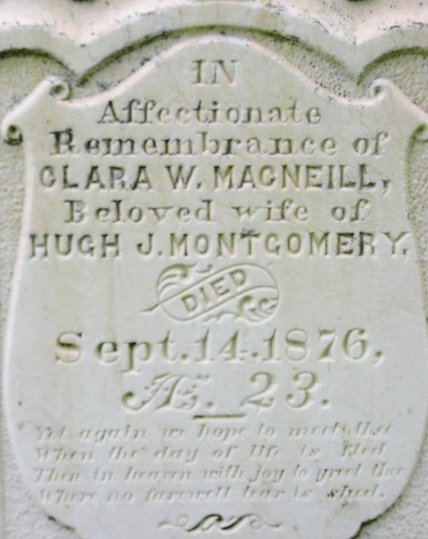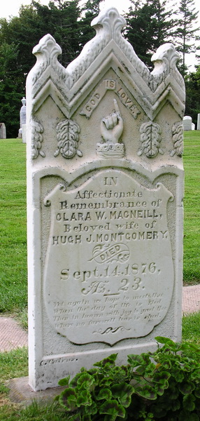 | Burial | She was buried in Cavendish Cemetery, Cavendish, Queens County, Prince Edward Island, Canada, 46.490867, -63.378683G. Inscription:In / Affectionate / Remembrance of / Clara W. MacNeill / Beloved Wife of / Hugh J. Montgomery / Died / Sept. 14, 1876, / AE. 23. / - / Yet again we hope to meet thee / When the day of life is fled / then in heaven with joy to greet thee / Where no farewell tear is shed / C. Cairns [stonecutter].4 Tombstone, Clara Woolner McNeill (1853-1876), Cavendish Cemetery, Cavendish, Queens County, Prince Edward Island, Canada.  Inscription detail. |