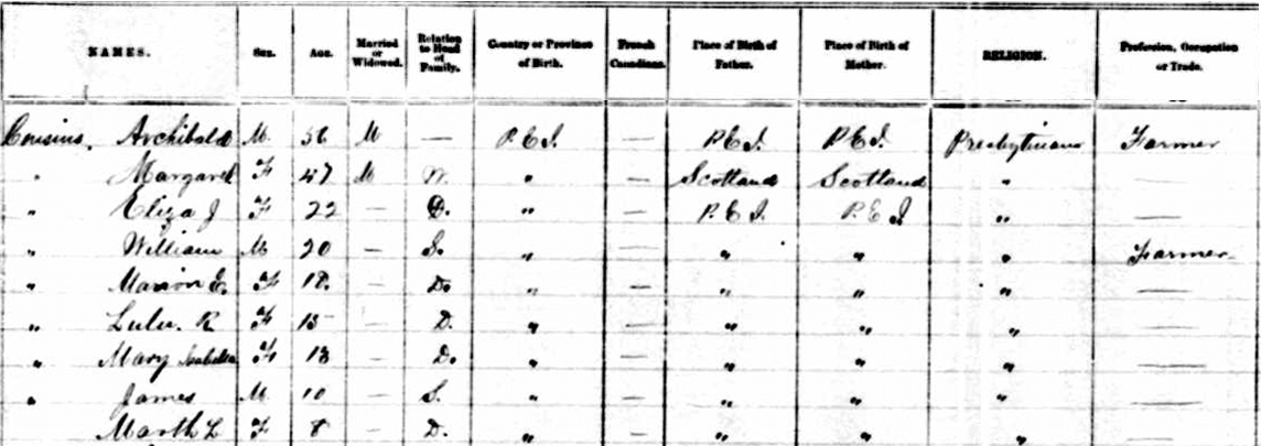 | Witness | She was enumerated on the census on 23 April 1891 in the household of Archibald Cousins in Lot 18, Prince County, Prince Edward Island, CanadaG. included in the household were Archibald's wife Margaret (age 47), and their children Eliza (age 22), William (age 20), Marion (age 18), Lulu (age 15), Mary Isabella (age 13), James (age 10) and Martha (age 8). The family religion was Presbyterian.2 1891 Canada Census, Lot 18, Prince Edward Island, household of Archibald Cousins, his wife Margaret and children Eliza, William, Marion, Lulu, Mary Isabella, James and Martha. |