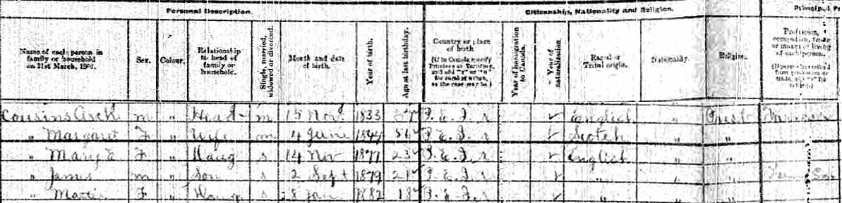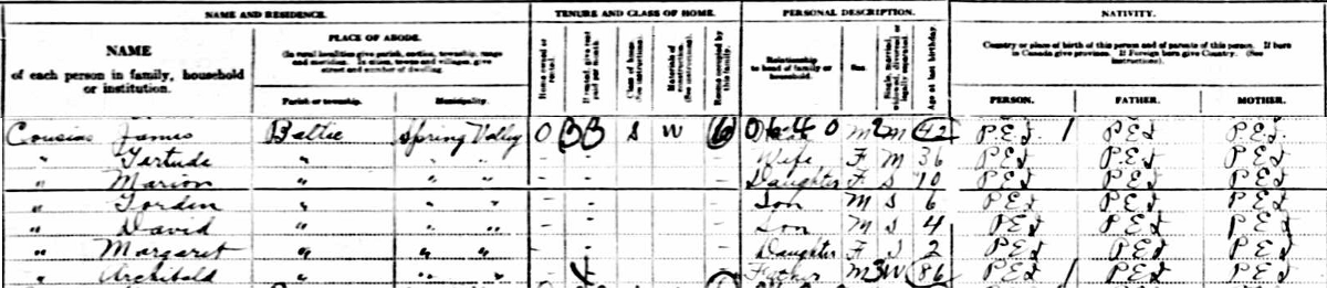 | Witness | She was enumerated on the census on 7 May 1901 in the household of Archibald Cousins in Lot 18, Prince County, Prince Edward Island, CanadaG. included in the household were Archibald's wife Margaret and their children, Mary (age 23), James (age 21) and Martha (age 18). Archibald and James were farmers. The family religion was Presbyterian.3 1901 Canada Census, Lot 18, Prince Edward Island, household of Archibald Cousins, his wife Margaret, and children Mary, James and martha. |