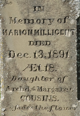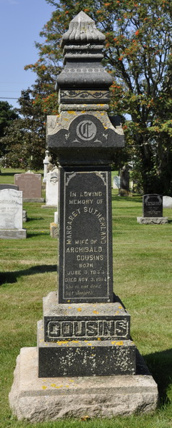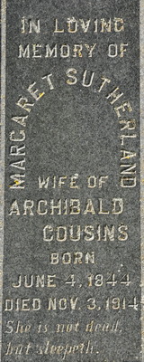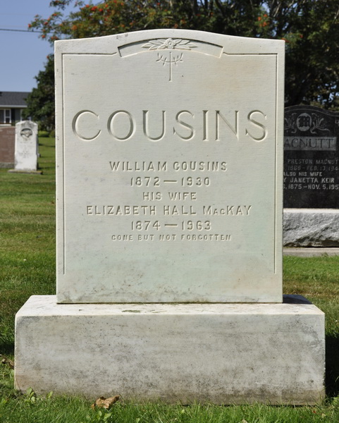 - [S8622] Cemetery marker, Peoples Cemetery, Malpeque, Prince County, Prince Edward Island, Canada. James Cousins & Gertrude MacKay, tombstone inscription; read by David A. Walker, 16 August 2013.