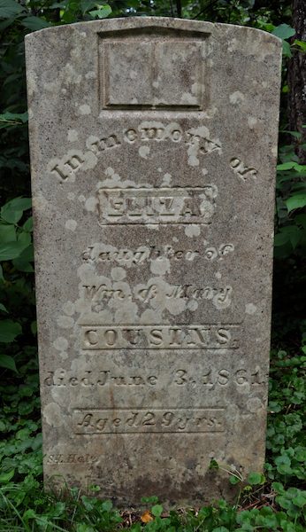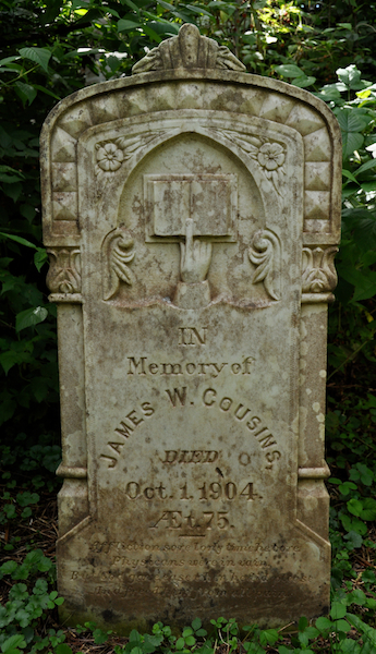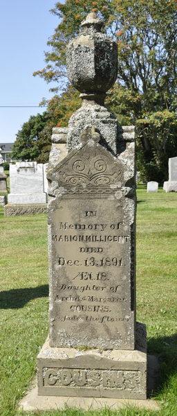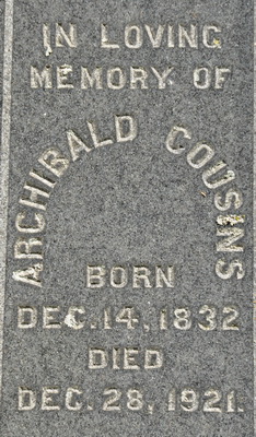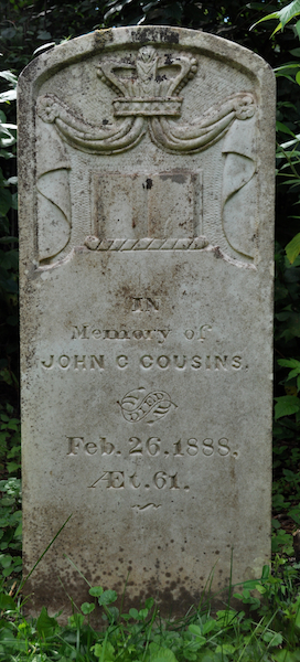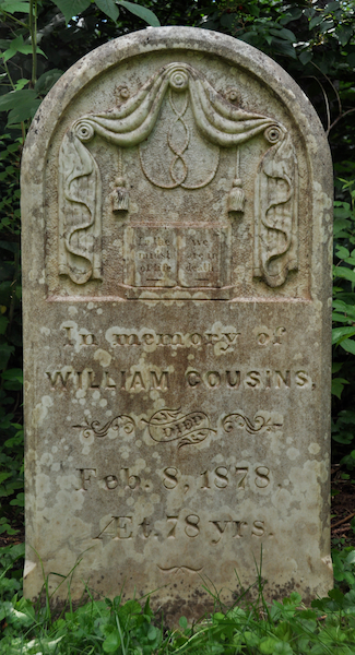 | Biographical Note | The following text was transcribed from the plaque adjacent to his tombstone: "William Cousins, son of John Cousins and Mary Townsend, was born September 9, 1799. In the 1890's (sic) he married Mary Waugh and farmed a portion of his father's farm at Park Corner. He was also known as a shipbuilder and was referred to as Esquire. William and Mary were members of the Church of England and had five children, John C., James Waugh, Eliza, Archibald and Rachel".1 |