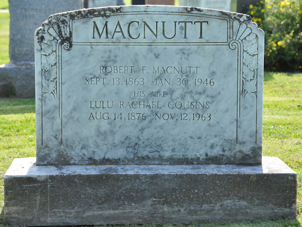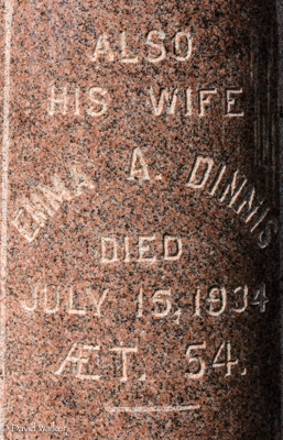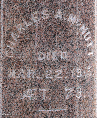 Inscription: In Loving / Memory of / Rachael Cousins / Wife of / Chas. A. McNutt / Born May 24, 1838 / Died / Jan. 30, 1899 / She is not dead / but sleepethLeft: Also / His Wife / Emma A. Dinnis / Died / July 15, 1934 / ÆT. 54.Right: Charles A. McNutt / Died / Mar. 22, 1915, / ÆT. 73.1  Tombstone, Charles A. McNutt (1842-1915), his wives Rachael Cousins (1838-1899) and Emma A. Dinnis (1880-1934). Peoples Cemetery, Malpeque, Prince County, Prince Edward Island, Canada.  Front inscription detail.  Left inscription detail.  Right inscription detail.
