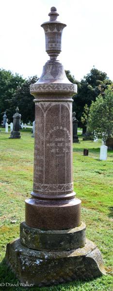 | Burial | He was buried in North Bedeque Cemetery, Prince County, Prince Edward Island, Canada, 46.36147, -63.72606G. Inscription: In / Memory of / Nathan McFarlane / Died / Jan. 1, 1886, / Æt. 80 / Also his wife / Margaret Silliker / Died / May 14, 1869, / Æt. 72 / McFARLANELeft: Muriel Alice / Daughter of / Charles & Margaret / E. McFarlane / Died Dec. 24, 1892 / Aged 8 months & / 13 daysRight: Charles C. McFarlane / Died / Oct. 14, 1909 / Also His Wife / Margaret E. Waugh / Died / Oct. 17, 1909 / Æt. 49.1 Tombstone, Nathan McFarlane (1805-1886), his wife Margaret Silliker (1797-1869), their son Charles (1850-1909), his wife Margaret E. Waugh (1860-1909), their daughter Muriel Alice (1892-1892). North Bedeque Cemetery, Prince County, Prince Edward Island, Canada.  Front inscription detail.  Left inscription detail.  Right inscription detail. |