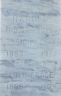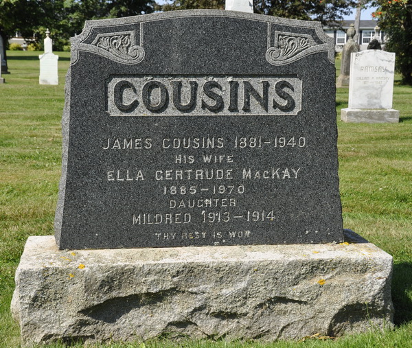 | Burial | She was buried in the Peoples Cemetery, Malpeque, Prince County, Prince Edward Island, Canada, 46.52978, -63.68746G. Inscription: COUSINS / James Cousins 1881 - 1940 / His Wife / Ella Gertrude MacKay / 1885 - 1970 / Daughter / Mildred 1913 - 1914 / Thy Rest is Won.4 Tombstone, James Cousins (1881-1940), his wife Ella Gertrude MacKay (1885-1970), their daughter Mildred (1913-1914). Peoples Cemetery, Malpeque, Prince County, Prince Edward Island, Canada. |