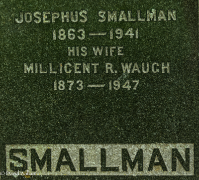 Inscription: Jane Little / Wife of / Samuel Waugh / 1848 - 1937 / WAUGHBack: Josephus Smallman / 1863 - 1941 / His Wife / Millicent R. Waugh / 1873 - 1947 / SMALLMAN.1,5  Tombstone, Jane Little (1848-1937), her daughter Millicent (1873-1947), her husband Josephus Smallman (1863-1941). Peoples Cemetery, Summerside, Prince County, Prince Edward Island, Canada.  Back inscription detail.