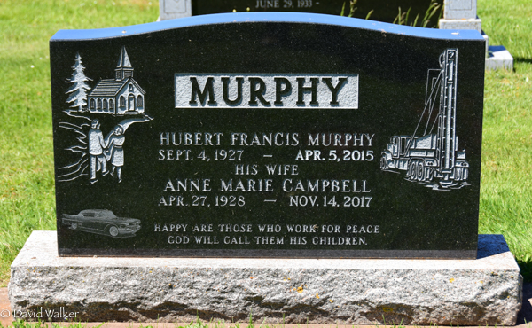 Inscription: MURPHY / Hubert Francis Murphy / Sept. 4, 1927 - Apr. 5, 2015 / His Wife / Anne Marie Campbell / Apr. 27, 1928 - Nov. 14, 2017 / Happy are those who work for peace / God will call them his children.3,2,4  Cemetery marker, Hubert Francis Murphy (1927-2015), his wife Anne Marie Campbell (1928-2017). St. Mary's Roman Catholic Cemetery, Indian River, Prince County, Prince Edward Island, Canada.