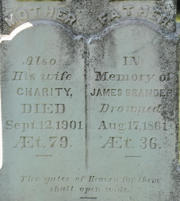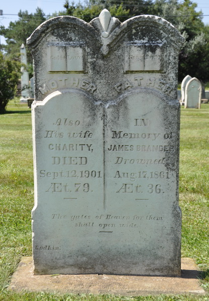 | Burial | She was buried in the Peoples Cemetery, Malpeque, Prince County, Prince Edward Island, Canada, 46.53028, -63.68764G. Mother / Also his wife / Charity / Died / Sept. 12, 1901 / ÆT. 79. | Father / In / Memory of / James Brander / Drowned / Aug. 17, 1861 / ÆT. 36. // The gates of Heaven for them / shall open wide.1 Tombstone, James Brander (1825-1861) and Charity Campbell (1822-1901). Peoples Cemetery, Malpeque, Prince County, Prince Edward Island, Canada.  Inscription detail. |