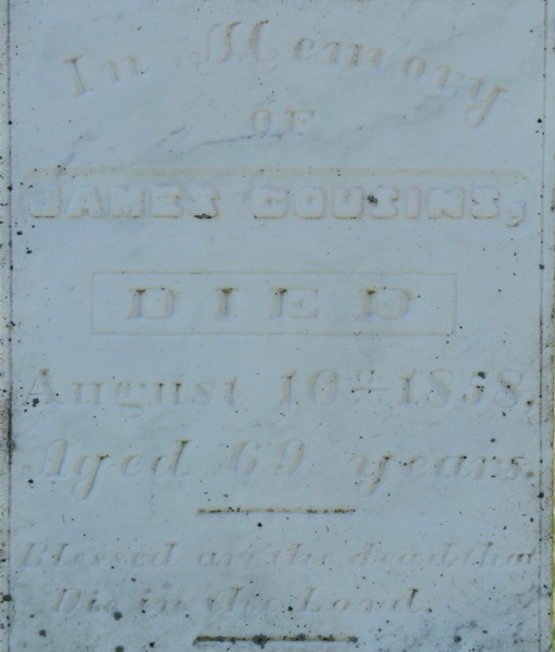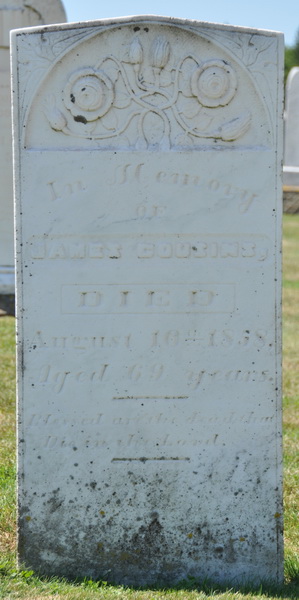 | Burial | He was buried in Geddie Memorial Cemetery, Springbrook, Queens County, Prince Edward Island, Canada, 46.49421, -63.50716G. stone #198. Inscription: In memory / of / James Cousins / Died / August 10th, 1858, / Aged 69 years / - / Blessed are the dead that / Die in the Lord.3 Tombstone, James Cousins (1789-1858). Geddie Memorial Cemetery, Springbrook, Queens County, Prince Edward Island, Canada.  Front inscription detail. |