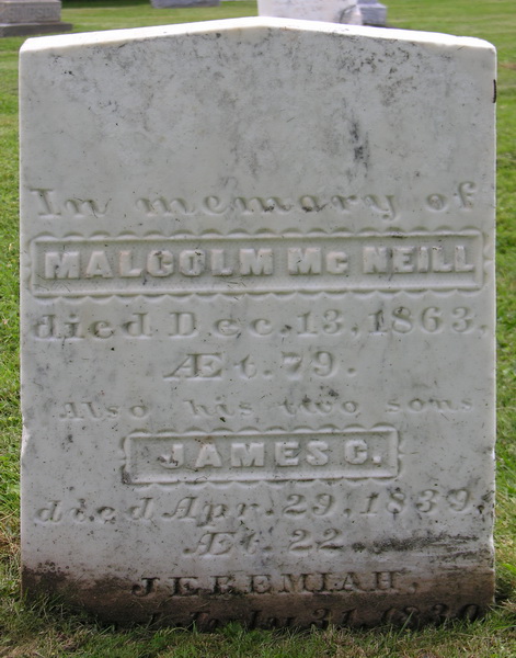 | Burial | He was buried in Cavendish Cemetery, Cavendish, Queens County, Prince Edward Island, 46.490967, -63.379033G. Inscription: In memory of / Malcolm McNeill / died Dec. 13, 1863, / AEt. 79. / Also his two sons / James C. / died Apr. 29, 1839 / AEt. 22 / Jeremiah, / Died July 31, 1830.1 Tombstone, Malcolm McNeill (1784-1863), his sons James (1817-1839) and Jeremiah (?-1830). Cavendish Cemetery, Queens County, Prince Edward Island, Canada. |